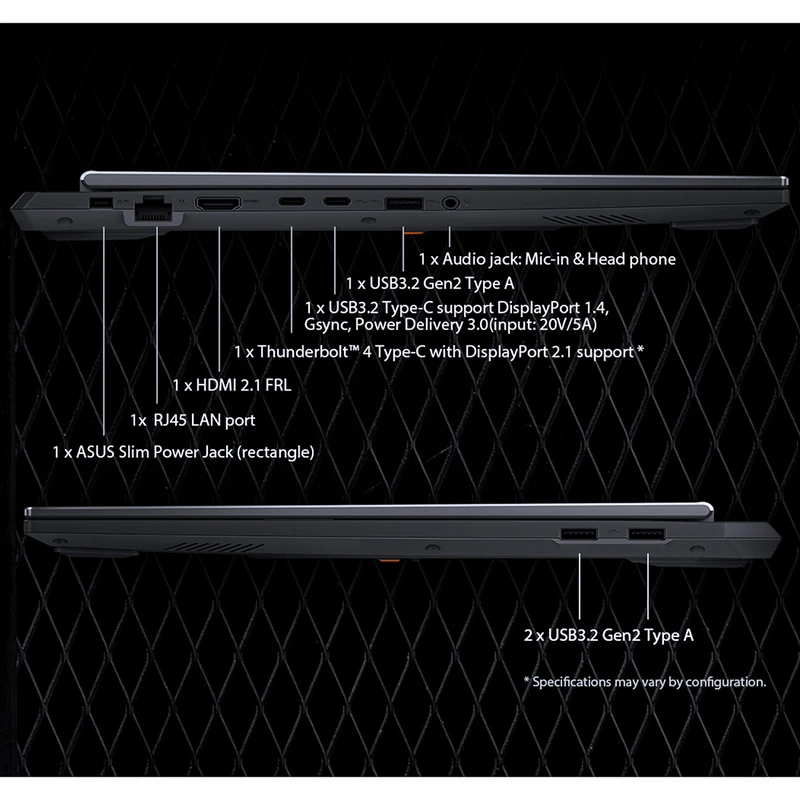 دو عدد USB-C (یک عدد Thunderbolt ۴ با سرعت ۴۰ گیگابیت بر ثانیه و پشتیبانی از DisplayPort و G-SYNC، یک عدد USB ۳.۲ Gen۲ با سرعت ۱۰ گیگابیت بر ثانیه و پشتیبانی از DisplayPort و شارژ) / سه عدد USB-A (Gen۲ با سرعت ۱۰ گیگابیت بر ثانیه)