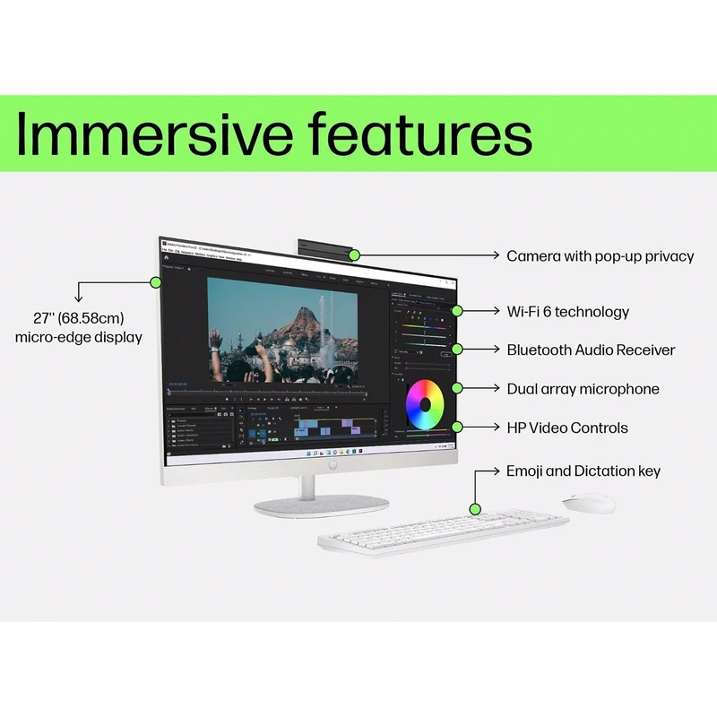 رایانه HP All-in-One 27-cr0153nh تلفیقی از طراحی مدرن، کاربری آسان و تعهد به پایداری محیطزیست است. این دستگاه با برخورداری از نمایشگر 27 اینچی و باکیفیت، تصاویری شفاف و زنده ارائه میدهد. طراحی باریک با حاشیههای کم، جلوهای مینیمال و حرفهای به محیط کار یا منزل میبخشد و تجربهای دلپذیر در کاربری روزانه فراهم میآورد. از ویژگیهای شاخص این مدل، رویکرد پایدار شرکت HP در ساخت آن است. بخشی از اجزای دستگاه با استفاده از پلاستیک بازیافتی پس از مصرف، پلاستیکهای جمعآوریشده از سواحل و حتی ضایعات قهوه تولید شدهاند.