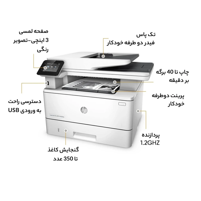 پردازشگر ۱۲۰۰ مگاهرتز / مجهز به برنامه موبایل HP eprint / قابلیت اتصال اختیاری سینی سوم ورودی کاغذ / ماکزیموم سایز اسکن ۲۱۶x۳۵۵.۶ میلیمتر